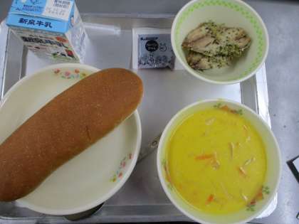 本日の献立は,コッペパン,ミルク,パンプキンポタージュ,あじの香草焼き,ブルーベリージャムの5品です。