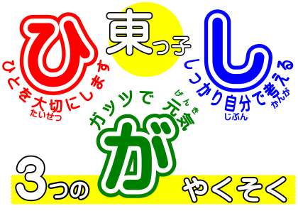 「東っ子 3つのやくそく」は,みんなが気持ちよく生活できるやくそくです。一年も半分が終わました。毎日をえがおとゲンキで「東っ子 3つのやくそく」をわすれず,「だれもが,気持ちのいい2学期」に後半をしましょう。