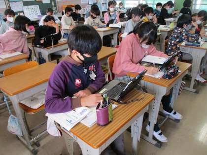 国語の時間です。「言葉の変化」を勉強しました。めあては「昔と今の言葉の変化について考えよう」。「キッチン」は「台所」。「スーツ」は「背広」など…タブレットを使いながら調べて,変化の様子を確認。普段使っている言葉が,変化していることに気が付いたかな?