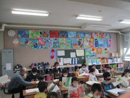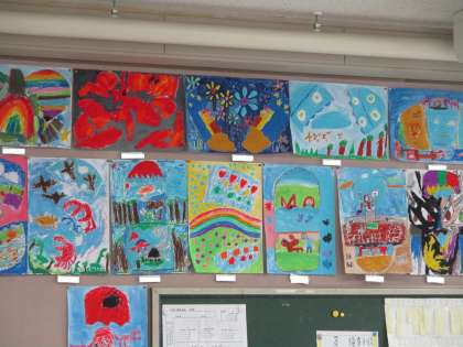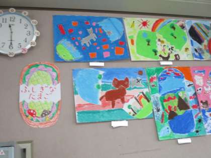 教室におじゃますると,後ろに素敵な絵が飾ってありました。子どもたちが,図工で取り組んだ「ふしぎな たまご」。ねこ,怪獣,海の生き物など…たまごの中から不思議なものが飛び出しました。楽しい,おもしろい,たまごの絵です。