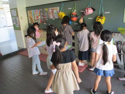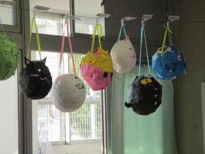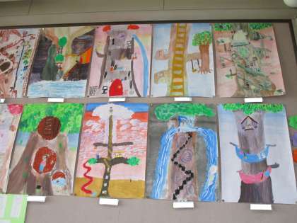 図工の作品の鑑賞をしました。作品は「大きな木と私」「風船で作ったランタン」。友だちの作品を鑑賞。素敵なところをいくつ見つけることができたかな?