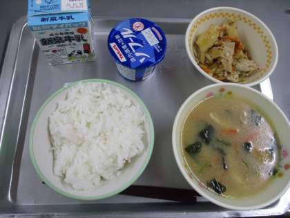 本日の献立は,ごはん,ミルク,五目汁,豚肉のマスタード焼き,ヨーグルト