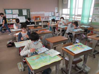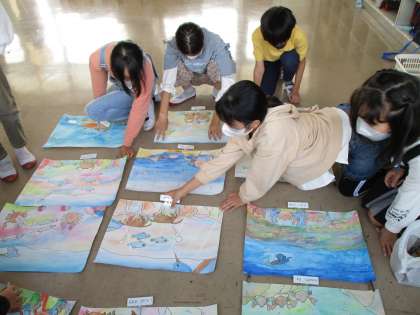 図工の時間です。「やまなし」の絵に取り組んでいます。作品もどんどん仕上がっていて,作品掲示の準備も先生から説明を受けて,自分たちでやりました。「やまなし」の絵,素敵に仕上がっています。