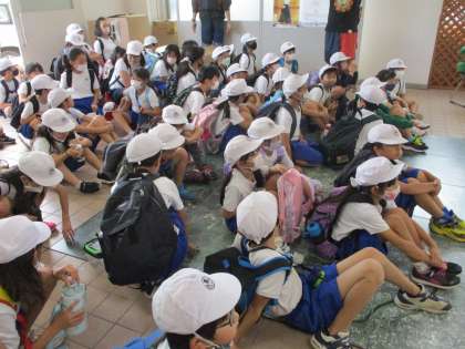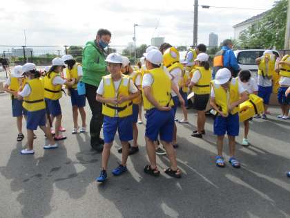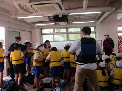 今日は3年生・4年生が合同で大和川に生き物調査に行きました。調査にあたって河川事務所の方々がいろいろと教えてくださいました。説明を聞いた後ライフジャケットを着て川におりました。