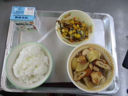 本日の献立は,ごはん,ミルク,おでん,和風サラダの4品です。