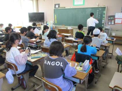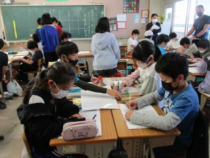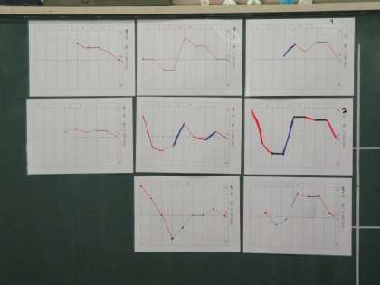 国語の時間です.「たずねびと」を勉強しています。めあては「物語全体の「綾」の心情の変化をまとめ,伝えよう」。子どもたちは「心の折れ線グラフ」で「綾」の心情の変化をグループで話し合って表しました。「綾」の心情の変化が分かったかな?
