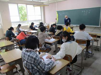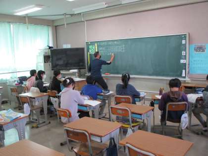 算数の時間です。「比例」を勉強しています。めあては「表を見て,比例するか調べよう」。教科書の問題にチャレンジ。表から時間と水の深さの関係が「比例」ということを確認。バッチリ「比例」のこと分かったようです。