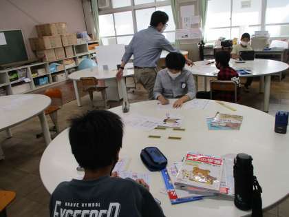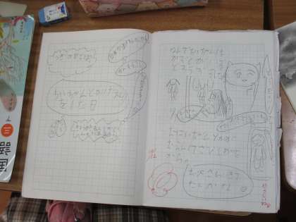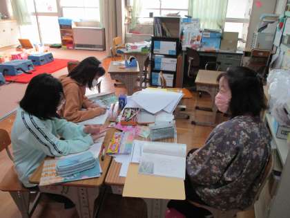 なかよし学級の3年生,6年生の子どもたち。3年生は国語の「ちいちゃんのかげおくり」,6年生は自分の課題に先生と一緒にしっかり取り組みました。ノートもしっかり書いていました。