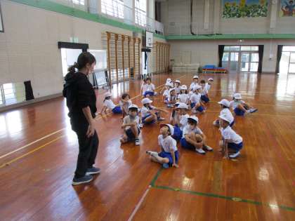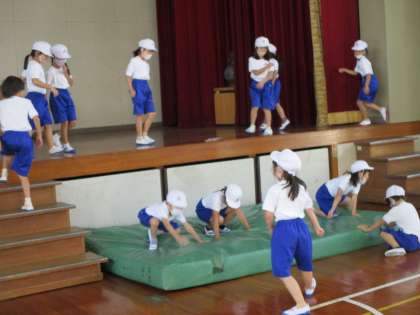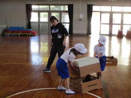 体育の時間です。はじめて,とび箱とマットに取り組みます。めあては「とび箱を使って,運動遊びをしよう」。先生から勉強のポイントを確認。自分たちで準備をしました。はじめてのとび箱とマットうまくできたかな?