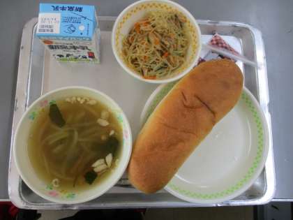 本日の献立は,コッペパン,ミルク,ちんげん菜スープ,春雨の炒め煮,チョコレートクリームの4品です。