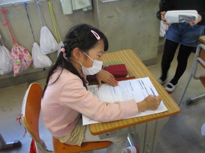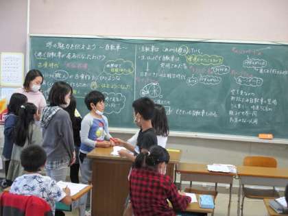 総合の時間です。昨日,見学に行った自転車博物館のまとめをしました。テーマは「堺の魅力を伝えよう〜自転車〜」。見学で発見したことを先生とみんなで確認。それをもとにワークシートにまとめました。