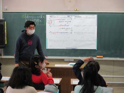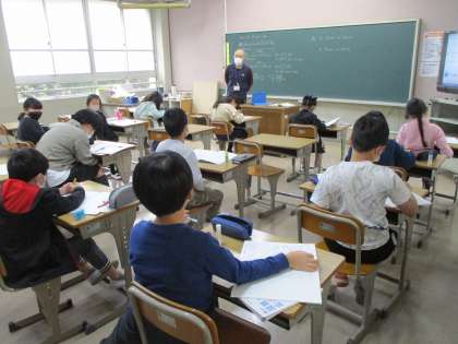 算数の時間です。めあては「倍やもとになる量を求める問題をしよう」。ゴムののび方のちがいや倍の見方の問題にチャレンジ。□を使って式を考えることがポイントでした。□の答えの出し方も分かったかな?