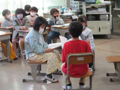 国語の時間です。「そうだんにのってください」を勉強しました。めあては「みんなで話をつなげよう」。相談の仕方をみんなで確認。グループごとに出て相談。それをみんなで見て相談の仕方を振り返りました。うまく,相談できたかな?