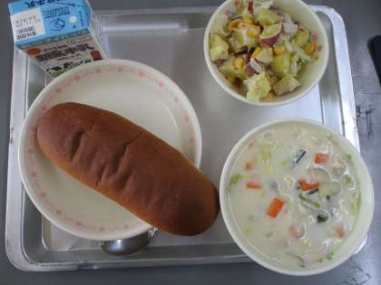 本日の献立は,ごはん,ミルクの,白菜とちんげん菜のクリーム煮,さつまいものサラダの4品です。