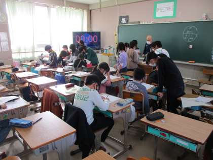 算数の時間です。「単位量当たりの大きさ」のテスト直しをしました。返ってきたテストのまちがい直しにチャレンジ。先生や友だちと一緒に取り組みました。まちがいを確認して,やり直すことが大切な勉強ですね。