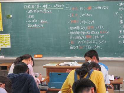 保健の時間です。「飲酒の害と健康について考えよう」に取り組みました。教科書などをもとに飲酒の害と自分の健康を守るためにどうしたらいいか,先生とみんなで話し合いました。どんなことに気を付けたらいいのか,わかったかな?