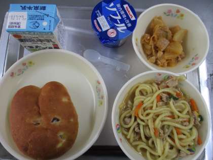 本日の献立は,おさつパン,ミルク,しょうゆラーメン,ピリ辛大根,ヨーグルトの4品です。