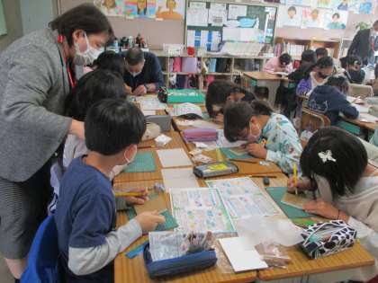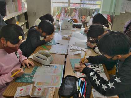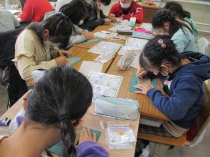 郵便局の方にお越しいただき,年賀状を書くときに使う,消しゴムハンコの作り方を教えていただきました。