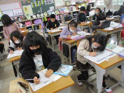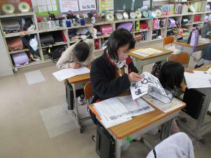 国語の時間です。「すがたを変える大豆」を勉強しています。今回は「すがたを変える○○」。「米」「とうもろこし」など…自分の決めた食べ物について取り組んでいます。どんな姿に変わるか?完成が楽しみですね。