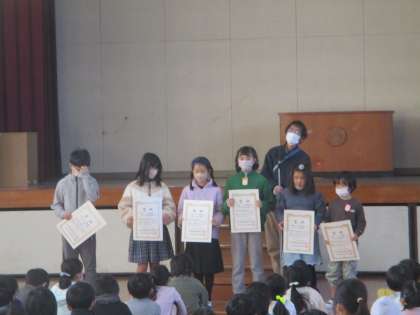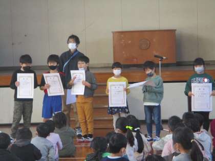 今日は朝会の後,作品についての表彰式をしました。上から「読書感想文コンクール」