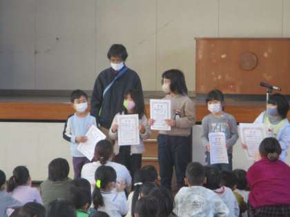 「幼少中美術展」「はとぶえコンクール」の表彰の様子です。