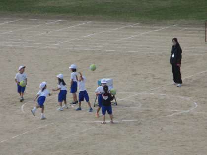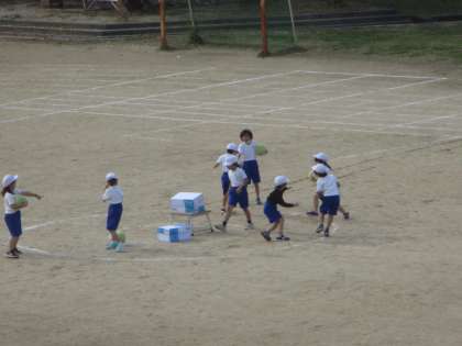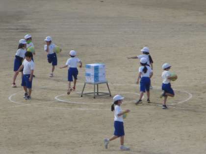 サークルの外側のチームがボールでサークル内の箱を狙い,サークル内のチームがボールから箱を守るゲームをしました。