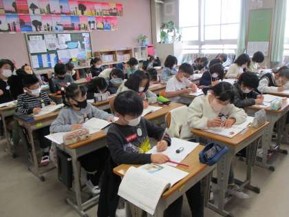 国語の時間です。「プラタナスの木」を勉強しています。めあては「設定や出来事を表にまとめよう」。場面ごとに,時間,場所,登場人物,出来事のポイントでまとめました。