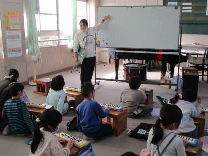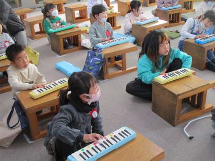 音楽の時間です。めあては「発表の準備をしよう」。音楽室におじゃますると,鍵盤ハーモニカの指使いの練習に取り組んでいました。曲は「ジングルベル」。先生と一緒にドレミを確認。がんばっていました。うまくできたかな?