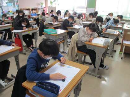 国語の時間です。漢字のまとめのテストに取り組みました。前の時間に習った漢字を確認。準備はバッチリです。テスト,きっといつもよりできたと思います。どうでしたか?