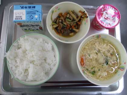 本日の献立は,ごはん,ミルク,むらくも汁,鉄分たっぷり煮,ヨーグルトの5品です。鉄分は体内で血液中にある酸素を体内に運ぶ働きのある,ヘモグロビンの材料として使われます。本日の鉄分たっぷり煮には,小松菜,乾燥ヒジキ,薄揚げ,大豆,切り干し大根,干しシイタケ,6品の鉄分を含む食材が使われています。