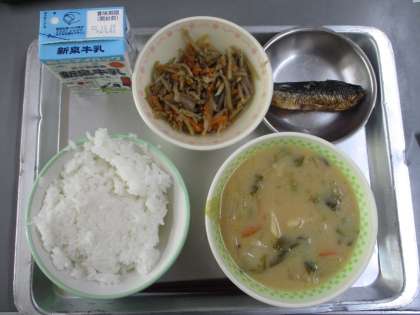 本日の献立は,ごはん,ミルク,せんべい汁,きんぴらごぼう,いわしのみりん干しの5品です。