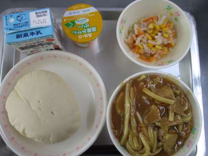 本日の献立は,オリーブパン,ミルク,カレーうどん,大根サラダ,フルーツゼリーの5品です。