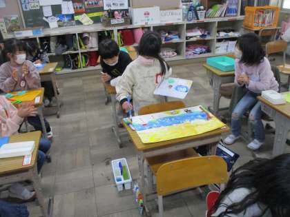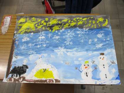 図工の時間です。「ゆきのふるまち」の作品に取り組んでいます。どんどん絵が仕上がっっています。どの作品も素敵な絵です。全員の作品ができるのが楽しみです。