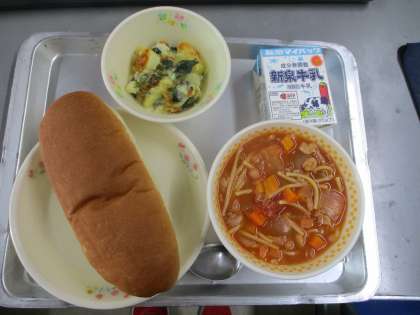 本日の献立は,コッペパン,ミルク,ミネストローネ,冬野菜グラタンの4品です。