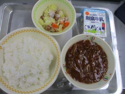 本日の献立は,ミルク,ハヤシライス,ポテトサラダの3品です。