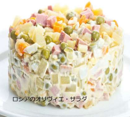ポテトサラダはゆでたじゃがいもを主な材料とするサラダです。日本ではマヨネーズで味付けをします。じゃがいも以外の野菜の収穫が難しかったロシアで,150年前リュシアン・オリヴィエさんが作ったオリヴィエサラダが起源だといわれています。明治時代,ジャガイモの栽培とともに,西洋料理の必つとして様々なポテトサラダが考案されました。1948年,戦争で販売中止となっていたマヨネーズが再び発売され,現在のポテトサラダができあがりました。