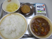 本日の献立は、米粉カレーライス、ミルク、とんかつ、オレンジポンチの4品です。