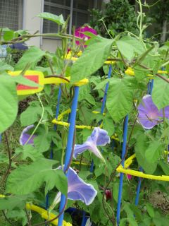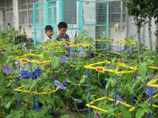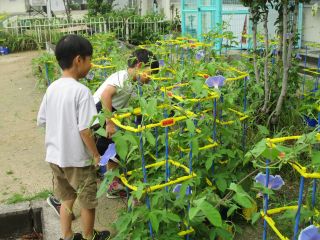 朝からあさがおが咲いているかチェックしに来る1年生。ブルーのあさがおが咲いていてほしいなぁとお友達と楽しそうに話しています。