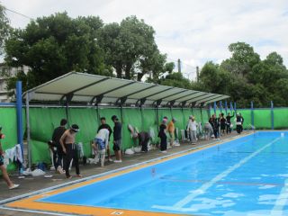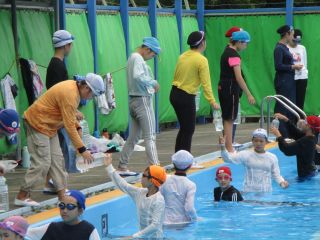 服を着てプールに入ります。万が一水難事故にあってしまった時の対処法を学びます。