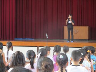 1学期最後の月曜朝会になりました。みんなと一緒に歌う校歌はやっぱり大好きな一曲です。お話の中で、セミの鳴き声でみんなと夏の訪れを共有できたこと嬉しい気持ちになりました。大切にしたい時間です。ますます熱い夏になりそうですが、熱中症に気を付けて残りの1学期を元気に過ごすことを子どもたちと約束しました。