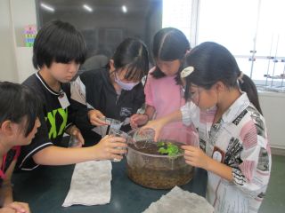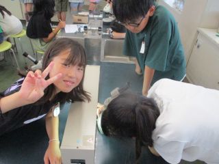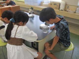 メダカの赤ちゃんを顕微鏡で観察しています。