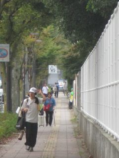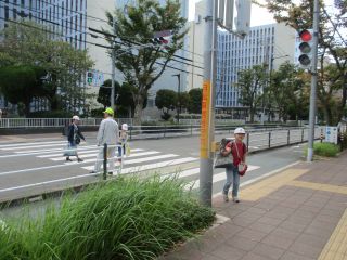 横断歩道直前で水筒のタスキが外れてしまったようです。登校を見守ってくださっている安全管理員さんが直してくれています。ありがとうございます。