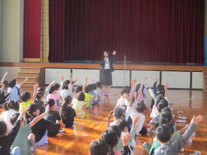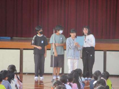 やさしい歌声の校歌が今朝も体育館に響きました。フェスタを楽しんだ人?はーい!とたくさんの子どもたちが参加しました。保健委員会からのお知らせ。