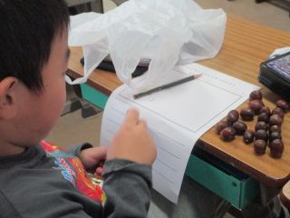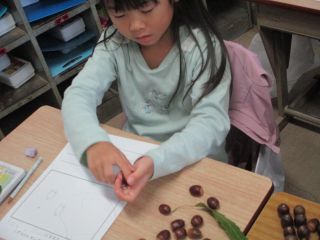 拾ってきたどんぐりの種類を見分け中の1年生。