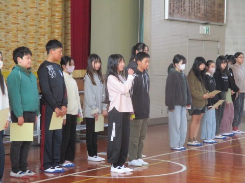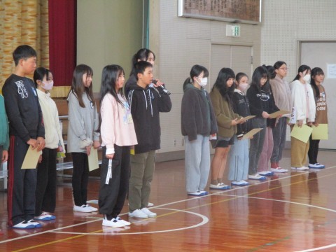 見守り隊の皆さんへ児童を代表して6年生代表委員が感謝を述べます。そして,見守り隊の代表の方からお言葉をいただきました。