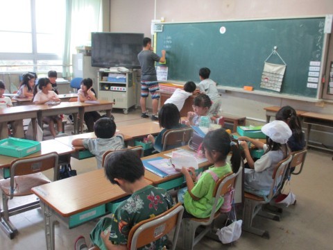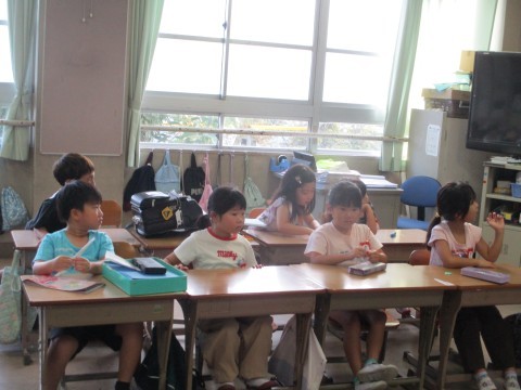 自習課題の算数プリントを一生懸命に解く1年生。学び合いも上手にできます。