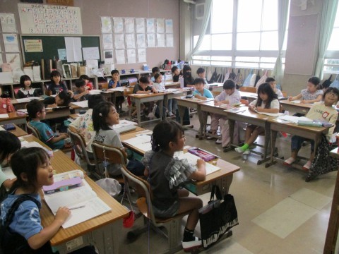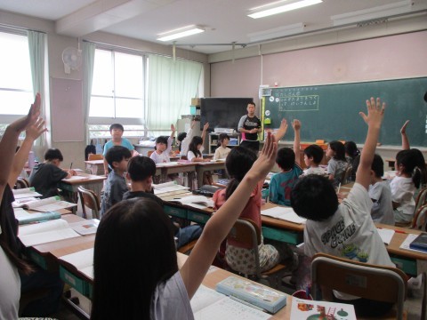 みんなで問題文を読み、考えています。手もいっぱい挙がっています。意欲的です。