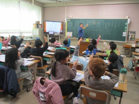 新出漢字です。読み方や使い方を共有しています。空書きをして、止め・はね・払いもしっかり意識していました。