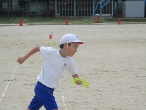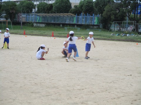 リングバトンでリレーに取り組みます。タイムを計って,明日は今日の自分を越えていきます。