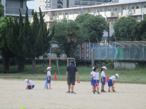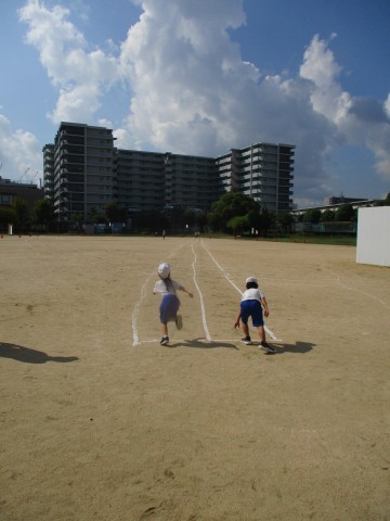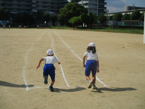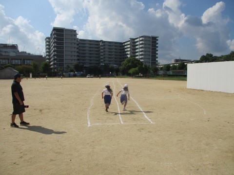 6年生の連合運動会の練習用に引いた100mの直線コースをかけっこします。100mって長いを実感できそうです。